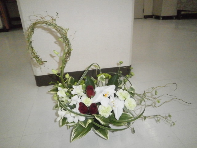 小さな葉の付いた枝を白鳥の頭から首にかけて形作り、