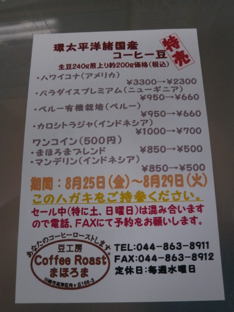 先日、珈琲豆店まほろまからセールのお知らせお葉書が届きました。