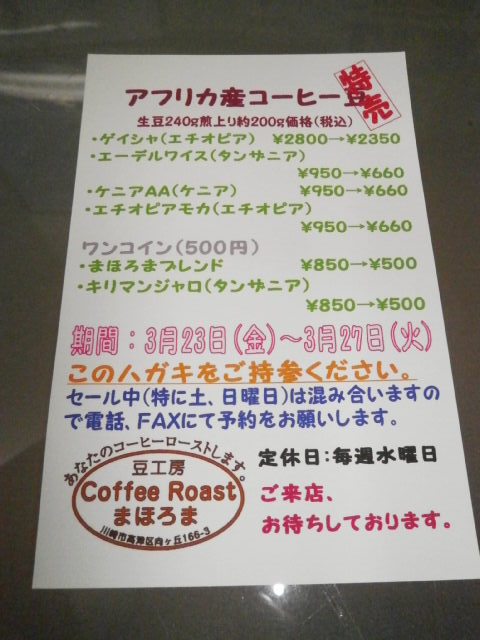 今日、珈琲豆店まほろまからセールのお知らせお葉書が届きました。