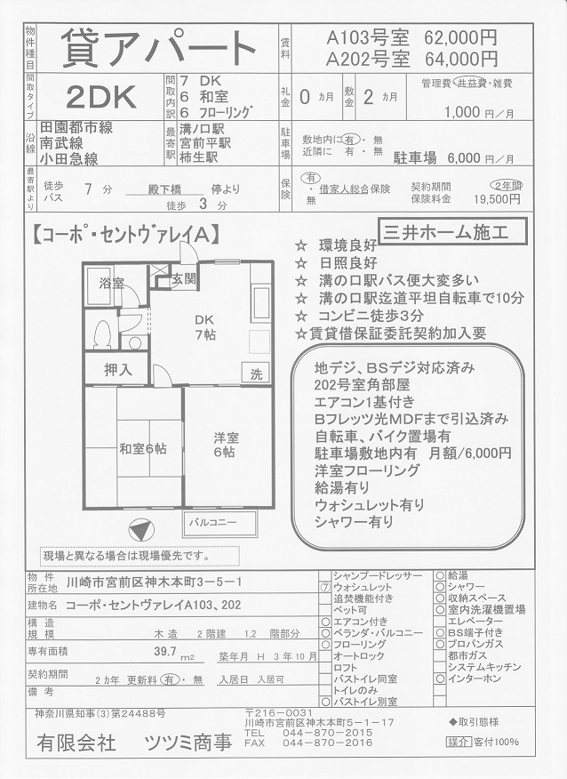 家賃 A103号室 月額62,000円 A202号室 月額64,000円
