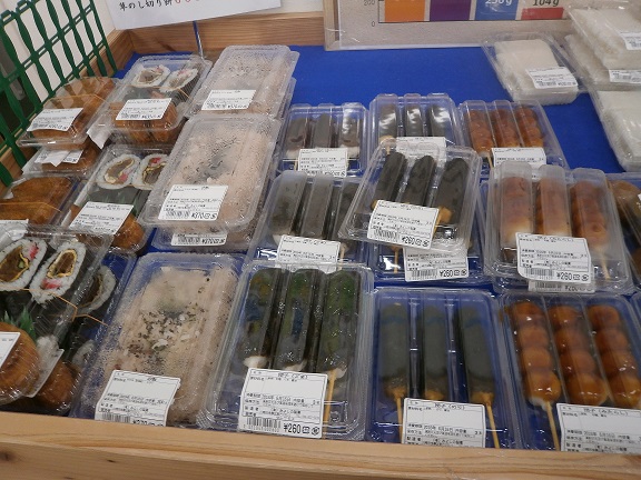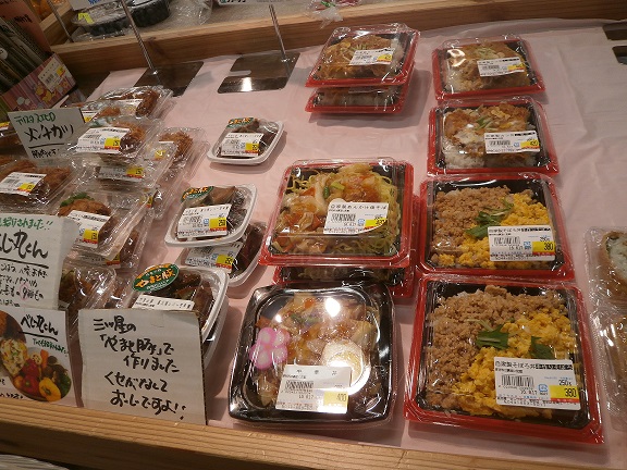 農家の奥様が作ったお団子やパン、そぼろ弁当、かつ丼、海苔巻、