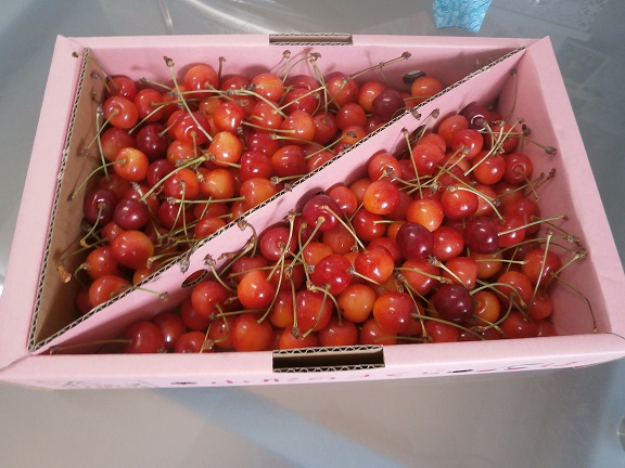 かつ丼、そしてひと箱1,000円の佐藤錦さくらんぼを購入しました。