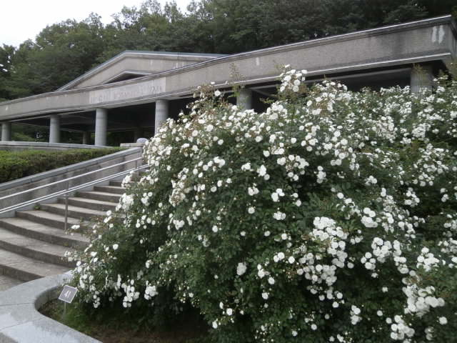 バラ苑を一望出来る建物の中央ベンチに腰をかけ