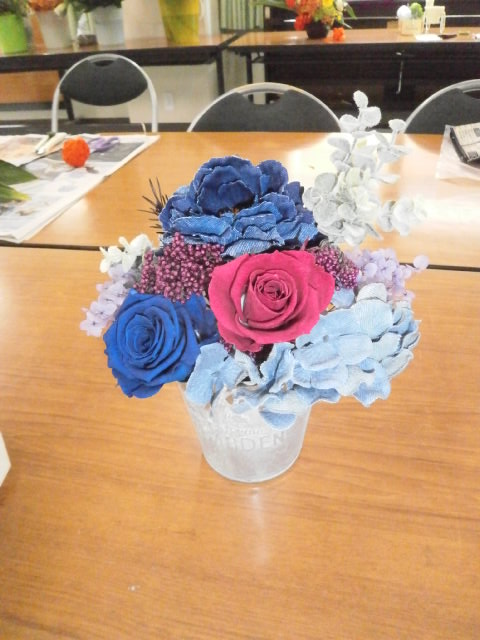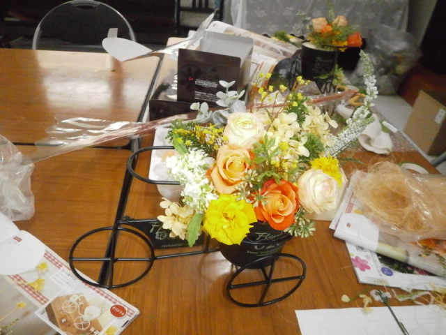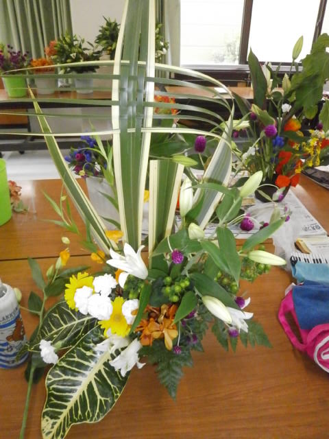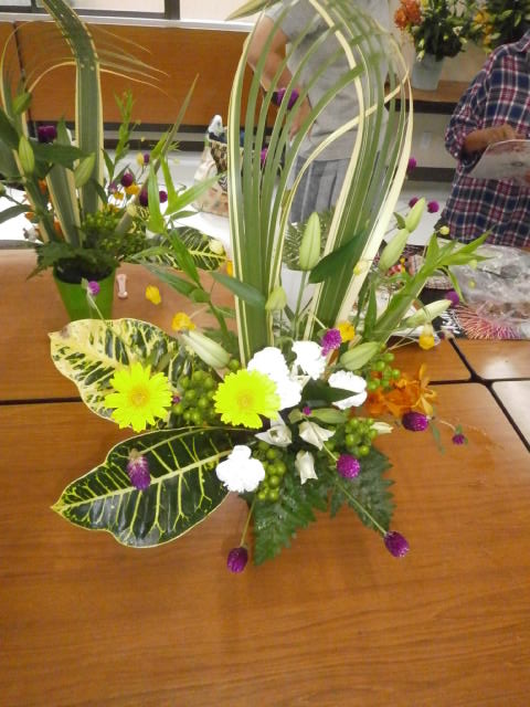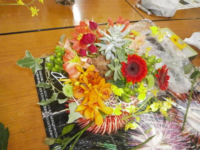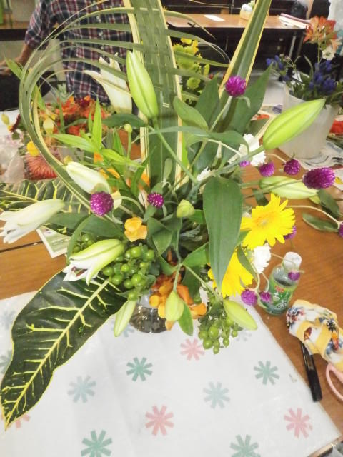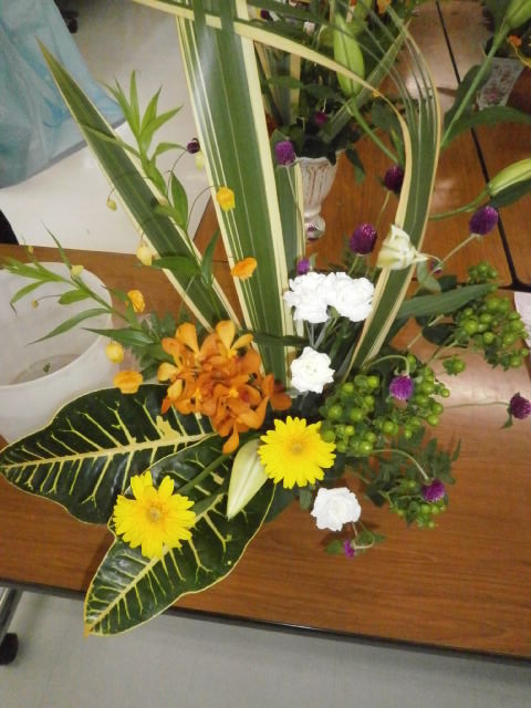 今回のフラワーアレンジメントは、葉をカゴ編みたいにする