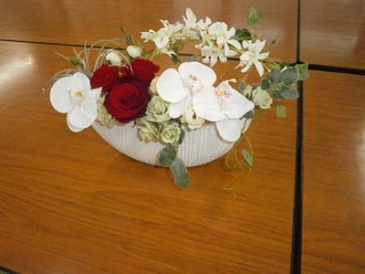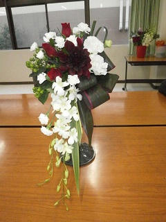 今回のフラワーアレンジメントは、バックブーケアレンジメントです。