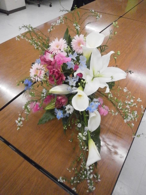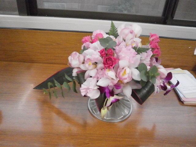 今回のフラワーアレンジメントは円柱の花器を使ったフラワーアレンジメントです。